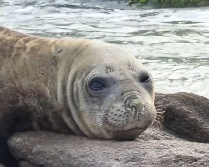 Foto: Reprodução O feriado de Tiradentes amanheceu com um visitante ilustre no Farol de Santa Marta, em Laguna. Um elefante-marinho foi encontrado pelo empresário João Baiuka descansando nas pedras.