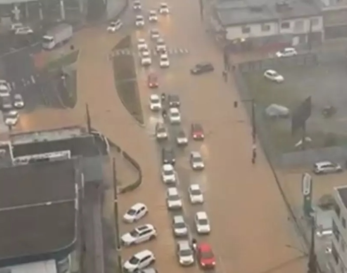 Divulgação/Folha Regional A forte chuva que atinge Santa Catarina nesta quinta-feira, dia 16, causa transtornos e paralisou o trânsito nas principais rodovias do Estado. Nas imediações de Balneário Camboriú, onde as chuvas foram mais fortes, a BR-101 foi bloqueada no Km 138, sentido Sul, devido a alagamentos.