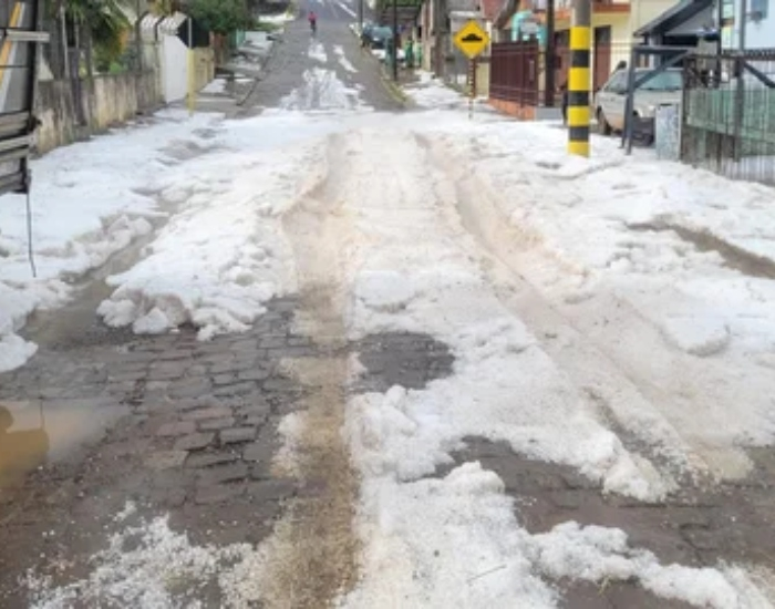 Divulgação/Folha Regional Uma intensa chuva de granizo surpreendeu os moradores de Vacaria, Sananduva e de outras cidades do Rio Grande do Sul na tarde desta terça-feira, dia 15, e deixou ruas completamente cobertas por pedras de gelo.