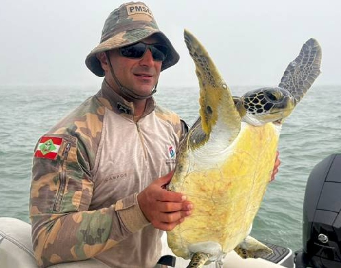 Durante patrulhamento aquático, a Polícia Militar de Santa Catarina (PMSC), por meio do 1º Batalhão de Polícia Militar Ambiental (BPMA), resgatou uma tartaruga-verde presa em uma rede de pesca ilegal.