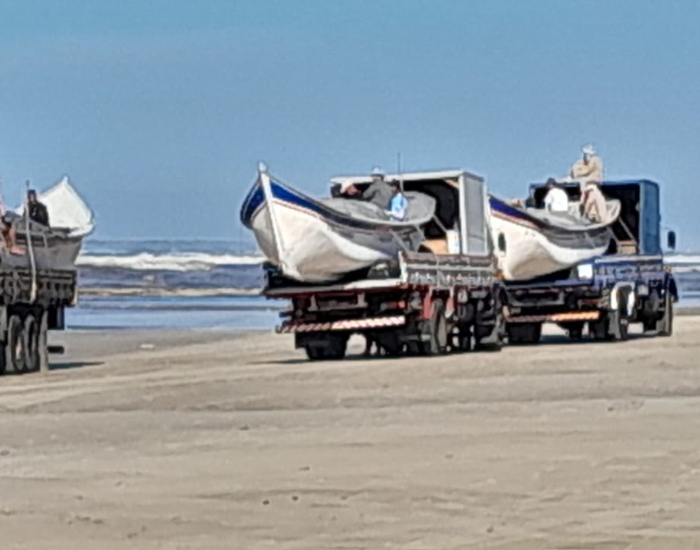 Em Jaguaruna, pescadores transitam à beira-mar com caminhões carregados com barcos e redes