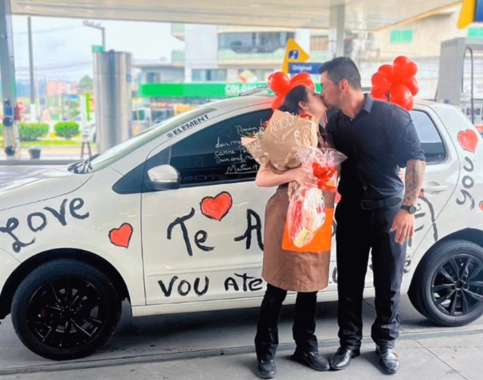 Para celebrar os 10 anos de casamento, Eliseu decidiu fazer algo inesquecível. Ele decorou seu carro com declarações de amor com frases como “Te amo, vou até a lua por você” e corações desenhados à mão, ele surpreendeu a esposa ao estacionar em seu local de trabalho com o carro decorado e foi até ela com um buquê de flores.
