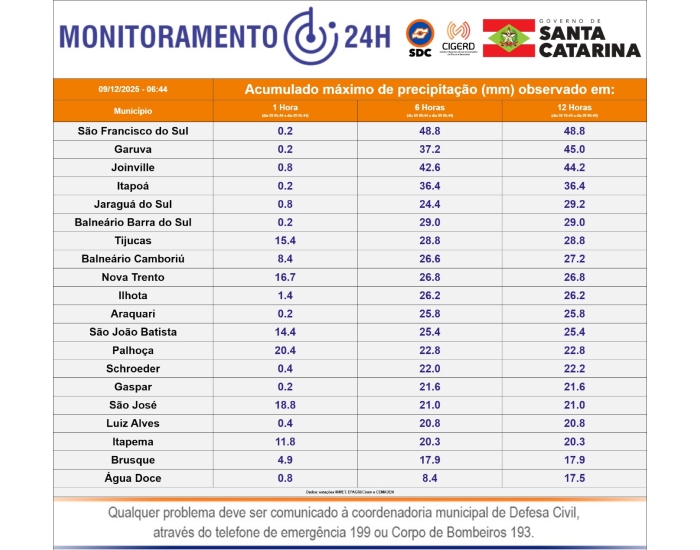 A região mais afetada é a do Norte do estado. Em apenas seis horas, choveu 48,8 milímetros em São Francisco do Sul. Na sequência vem Joinville. Enquanto a primeira registrou 48,8 milímetros de chuva em seis horas, a segunda registrou 42,6. Depois, vem Garuva, com 37,2.