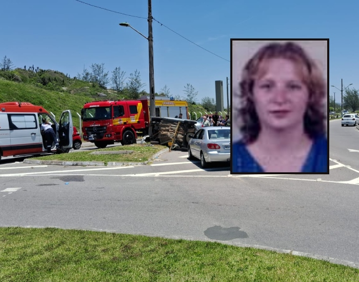 CBMSC/Divulgação/Folha Regional Uma mulher de 48 anos, identificada como Fabrícia Castro Bento, morreu após o veículo Celta, onde ela estava, colidir contra um poste e capotar. O acidente ocorreu neste sábado, dia 6, na Avenida João Marronzinho, no trevo da Praia do Gi, em Laguna.