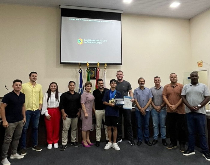 O atleta de Jaguaruna Lucas Rodrigues Heidmann foi homenageado durante a sessão ordinária na Câmara de Vereadores na noite desta quarta-feira, dia 13. Ao lado do professor Helton Cruz, o atleta recebeu uma Moção de Congratulações pela conquista do 1º lugar na categoria infantojuvenil até 51kg com vitória por nocaute no 4º Campeonato Brasileiro de Interclubes de Muay Thai, realizado em Balneário Camboriú nos dias 2 e 3 de dezembro.