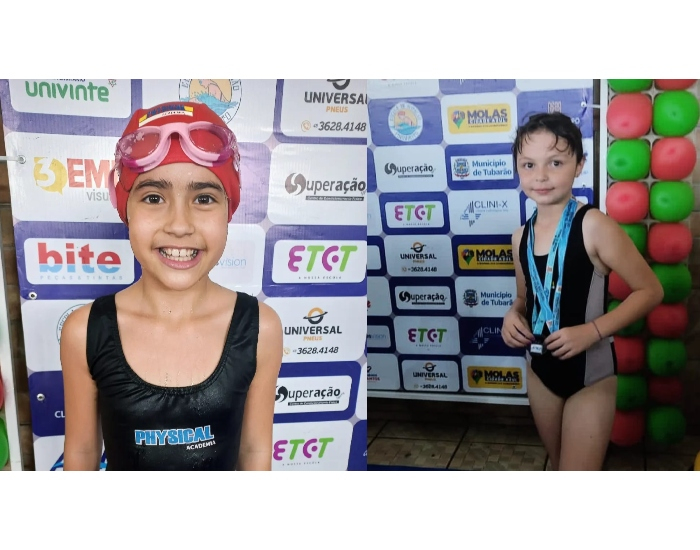 As pequenas Ana Clara Guetner Serafim e Alice Amaro Silvano, ambas de 9 anos, de Jaguaruna, participaram do Festival Pequenos Tubarões, no Clube 29, em Tubarão, e se destacaram pelo bom desempenho na competição e natação.