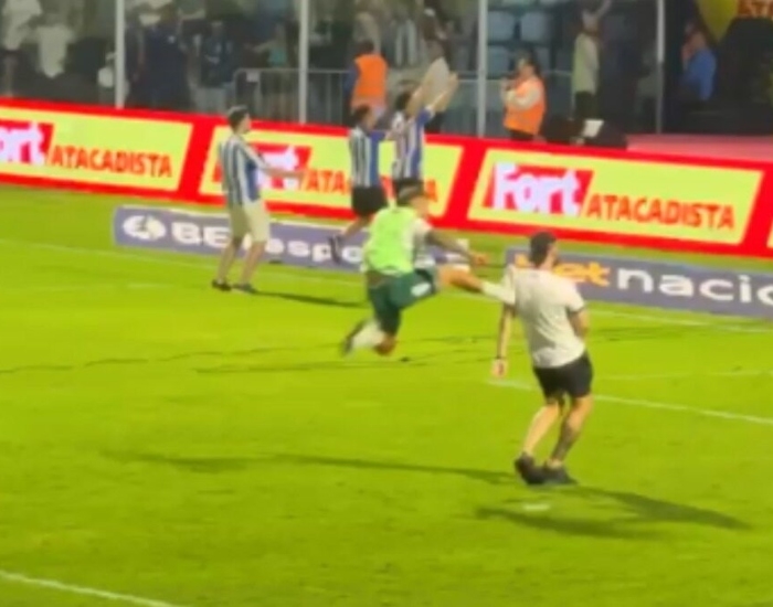 Um torcedor gravou o momento em que o jogador agride um homem com uma ‘voadora’ pelas costas. A imagem mostra o jogador, que chegou a ser expulsão no banco de reservas durante a confusão da marcação do pênalti para o Avaí, andando, pegando impulso e chutando um torcedor de camisa branca.