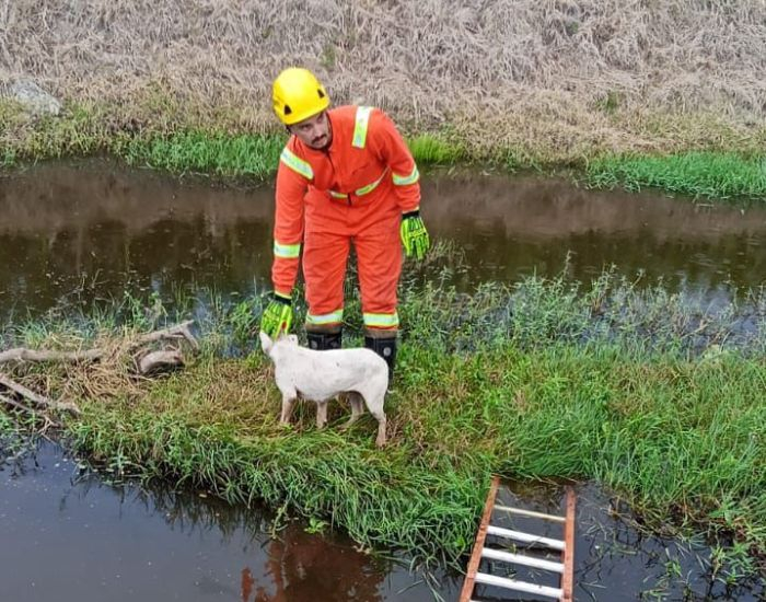 Ao chegar no ponto indicado, a guarnição confirmou que a cadela estava cercada pela água, sem conseguir retornar à margem por conta própria.