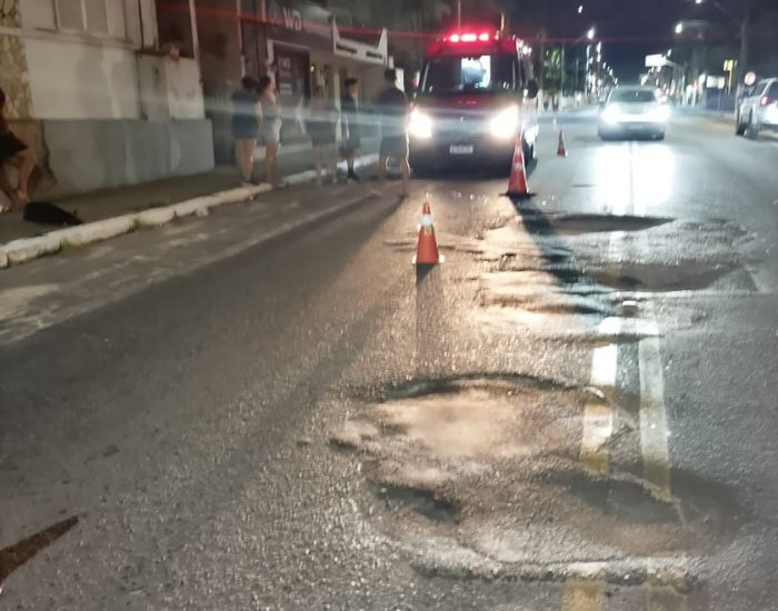 De acordo com as informações repassadas pela corporação, ao chegar ao local a guarnição encontrou o condutor de uma Honda Biz sentado na via pública. Ele relatava dores na região dos arcos costais e no cóccix.