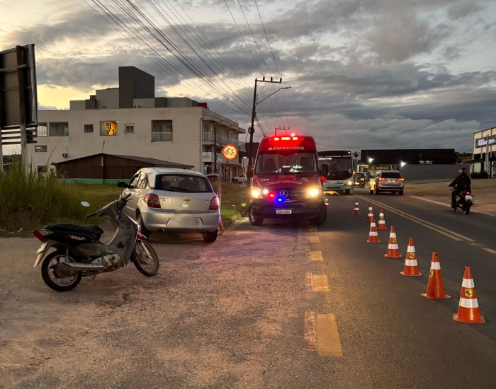 Os Bombeiros Voluntários foram acionados e constaram a ocorrência de uma colisão entre uma motocicleta Honda/Biz com placa de Treze de Maio, contra um automóvel Ágile, com placa de Capivari de Baixo.