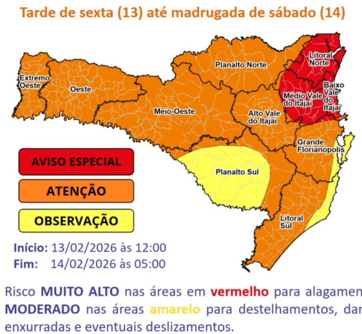 A orientação é que moradores do Sul de Santa Catarina redobrem a atenção, especialmente em áreas historicamente afetadas por enxurradas e deslizamentos.