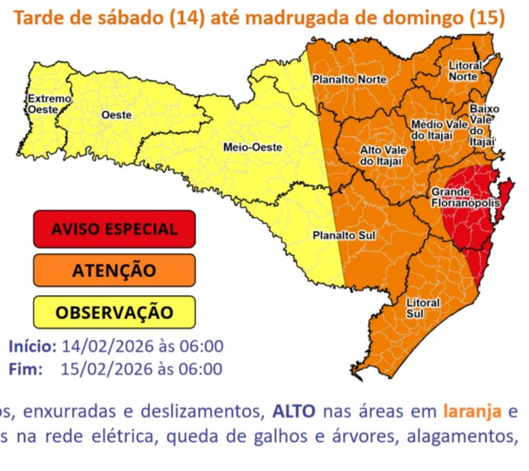 Entre a noite de sábado e a madrugada de domingo (15), a atenção se volta especialmente para cidades da Grande Florianópolis e parte do Litoral Sul. Nestas áreas, a previsão indica chuva persistente e intensa, com risco alto a muito alto para alagamentos e enxurradas.