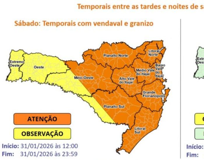No domingo (1º), à medida que o ciclone se afasta ainda mais da costa catarinense, a tendência é de enfraquecimento das instabilidades. A partir da tarde, os temporais devem ocorrer de forma mais isolada, com chuva pontualmente intensa entre o Litoral Norte e a Grande Florianópolis.