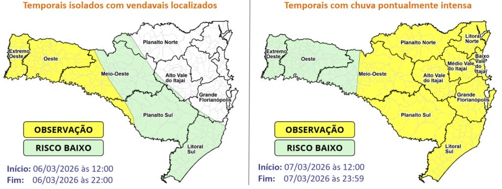 Litoral, Grande Florianópolis e Vale do Itajaí: estas áreas estão sob maior vigilância. O acumulado de chuva pode ser elevado em curto período, gerando risco moderado a alto para alagamentos e enxurradas.