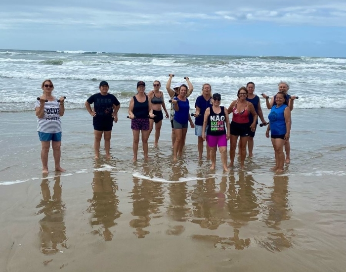 Com pé no mar e força nos braços, um grupo de pessoas a partir de 55 anos participou de uma aula especial na última semana no Balneário Arroio Corrente, em Jaguaruna.