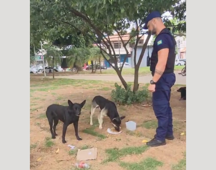 Reprodução/Folha Regional Amor aos bichos. Maciel Brognoli e Anderson Ferreira são agentes da Guarda Municipal de Tubarão. Já faz algum tempo, eles compram ração com recursos próprios e guardam na viatura para oferecer aos cães de rua, quando eventualmente encontram os bichinhos nas praças da cidade. Além da ração, eles também oferecem água.