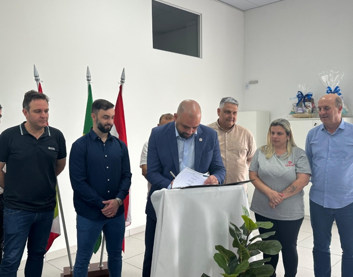Victória Lopes/Secom/Folha Regional O secretário de Estado da Saúde, Diogo Demarchi, assinou a ordem de serviço no valor de R$ 3 milhões para a ampliação do Centro Viver Bem, em Sangão, nesta segunda-feira, 15.