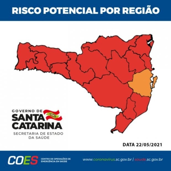 A Matriz de Risco Potencial divulgada neste sábado, dia 22, pela Secretaria de Estado da Saúde (SES) aponta que apenas uma região de Santa Catarina foi classificada no patamar Grave (cor laranja) e outras 15 na situação Gravíssima (cor vermelha) para a transmissão da Covid-19.