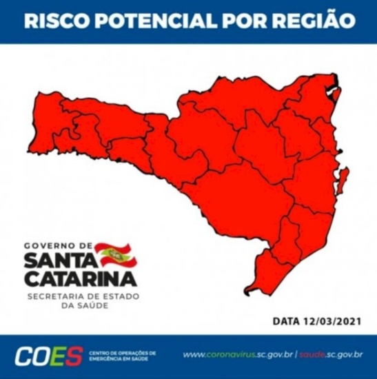 A Secretaria de Estado da Saúde divulgou neste sábado, 13, os dados da Matriz de Risco Potencial em relação ao novo coronavírus. O mapa aponta que todas as regiões catarinenses se encontram em nível gravíssimo (cor vermelha) pela terceira semana seguida.