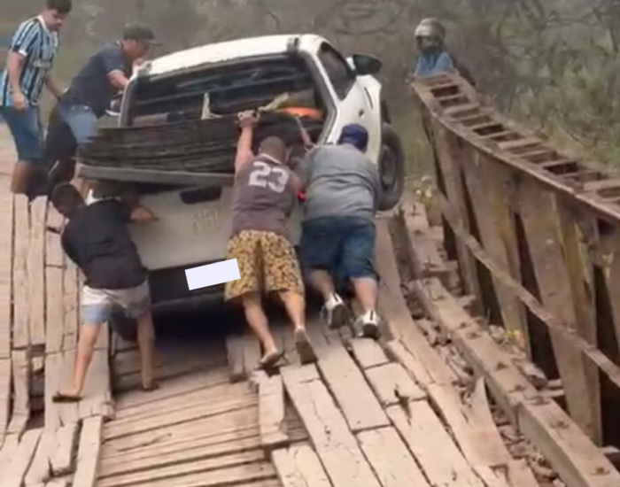 No vídeo (ASSISTA AQUI), o caminhoneiro conta do susto que levou ao passar pela ponte, que quebrou no momento. Um outro veículo teve que ser empurrado para não ficar preso entre as madeiras quebradas.