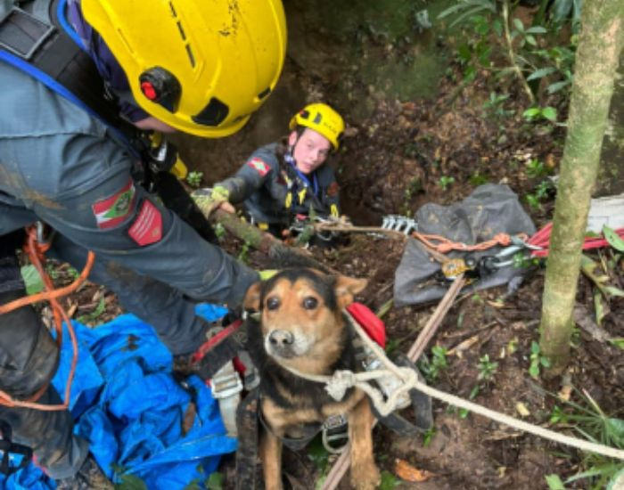 O que inicialmente parecia ser o resgate de apenas um animal ganhou um novo desdobramento. Durante a primeira descida, realizada com técnicas de salvamento em altura, o socorrista identificou que havia um segundo cachorro no fundo da galeria.