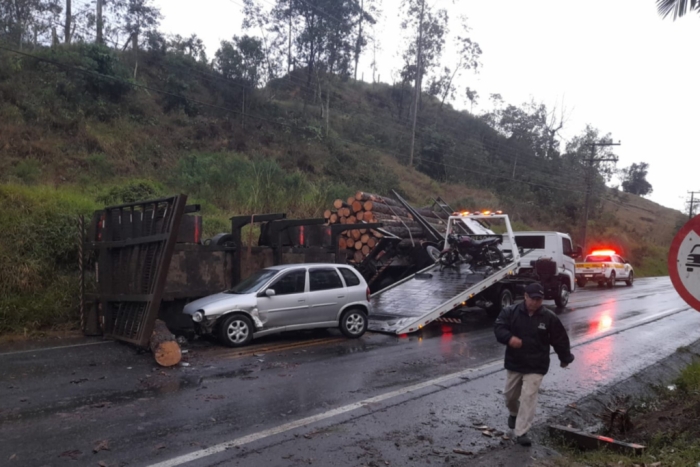 PMRv está no local. O caminhão tombou e a carga ficou espalhada na pista na manhã desta segunda-feira
