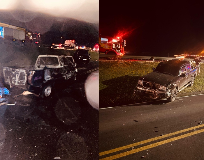 Com o impacto, a Fiorino pegou fogo. O motorista foi rapidamente retirado do carro e encaminhado ao hospital pelos bombeiros. Uma mulher, que também se envolveu no acidente, foi atendida pelo Samu.