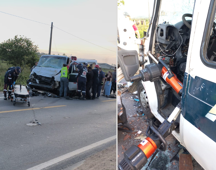 Um homem de 50 anos, condutor da van, também ficou encarcerado. Foi efetuado resgate veicular com uso da ferramenta combinada e do cilindro expansor. Ele estava consciente e orientado, apresentando fratura aberta no membro inferior direito. Foi conduzido pela equipe do SAER.