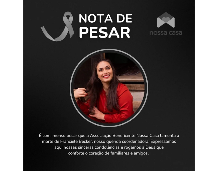 Franciele era coordenadora da Associação Beneficente Nossa Casa, de Criciúma, que acolhe crianças e adolescentes. Em nota, a instituição lamentou a morte. “Essa é a notícia que nós não queríamos dar. Infelizmente nossa coordenadora Franciele Becker fez a passagem. Pedimos boas energias neste momento tão difícil “, lamentou a associação.