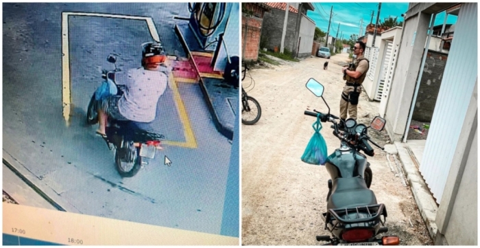 Após conversar com outras pessoas que se encontravam no local e visualizar as imagens de vídeo monitoramento do posto foi possível identificar a característica da motocicleta e do segundo envolvido que conduzia a motocicleta que fugiu do local após o roubo.
