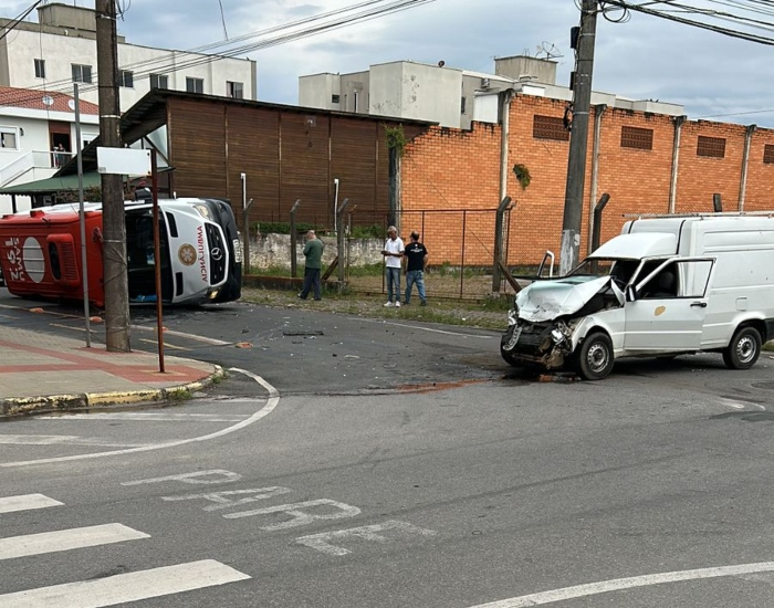 Uma ambulância do Samu tombou após acidente de trânsito registrado no início da tarde desta sexta-feira, dia 10, em um crazamento entre as ruas Roberto Zumblick e Antônio Hülse, no bairro Humaitá.