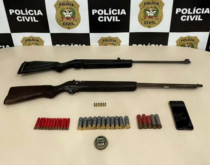 No interior do imóvel foram apreendidas duas espingardas, diversas munições de calibres 12, 36 e .22, além de carne de caça que será submetida a perícia.