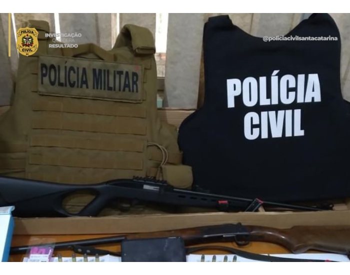 Com auxílio da Polícia Militar, foram apreendidos armas, munições, materiais de recarga de cartuchos, celular, pen drives e cartões de memória.