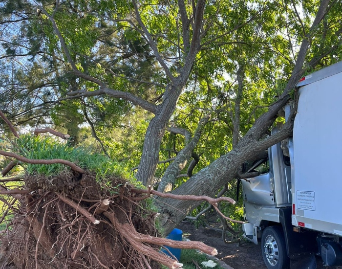 Um motorista saiu ileso após ter seu caminhão atingido por uma árvore de grande porte durante o temporal desta quinta-feira, dia 24, em Jaguaruna.