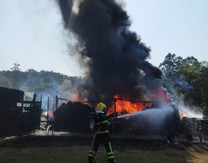 Um incêndio de grandes proporções atingiu parte de um clube de caça e tiro localizado no bairro Linha Torrens, em Morro da Fumaça.
