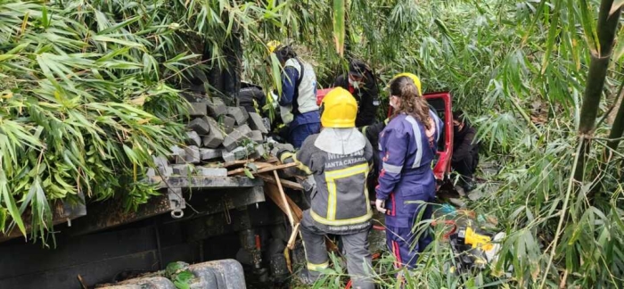 O caminhão caiu em um barranco em um local de difícil acesso nesta sexta-feira