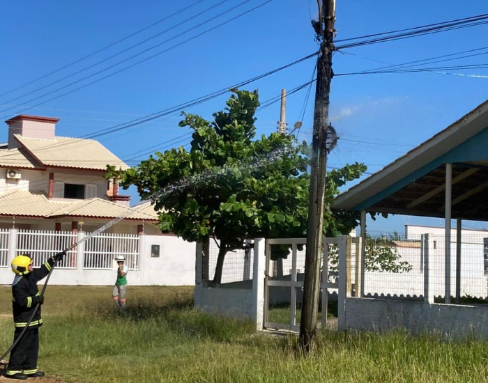 Foto: BVJ/Divulgação/Folha Regional Os Bombeiros Voluntários foram acionados para atender uma ocorrência de um incêndio em um poste de madeira na manhã desta segunda-feira, dia 3, no Balneário Campo Bom, em Jaguaruna. O poste apresentava risco de queda em cima de uma residência.