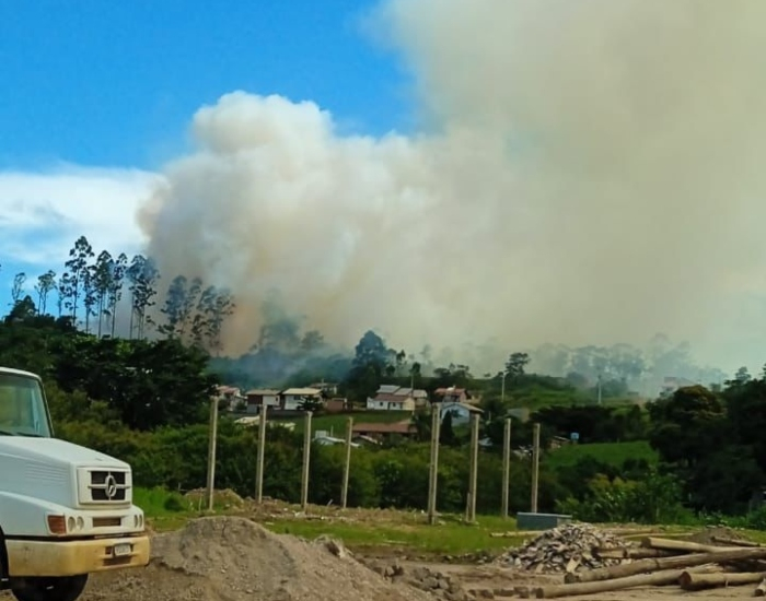 A guarnição dos Bombeiros Voluntários realizou o combate a um incêndio em uma área de reflorestamento de eucaliptos na Rua Alécio Rocha, em Sangão.