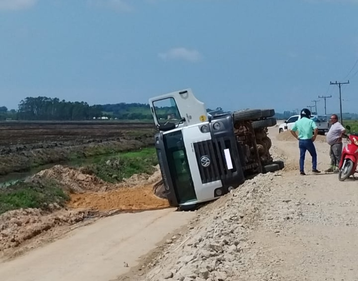 O caminhão de uma empresa de São José carregado com areia trafegava pelo local, quando o motorista perdeu o controle da direção ao ceder espaço e acabou tombando na via. O motorista não sofreu ferimentos, não sendo necessário acionar os Bombeiros Voluntários.