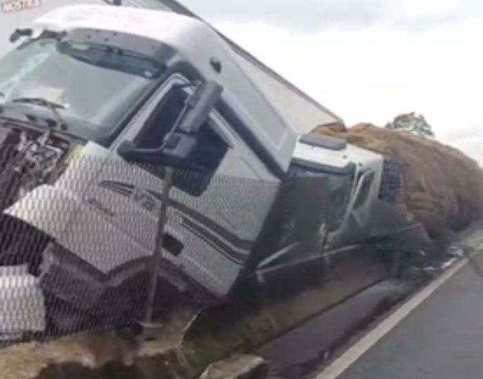 Foto: Redes sociais/Reprodução Um caminhão carregado com cerca de 19 mil quilos de melancias tombou na manhã desta quarta-feira (21) após um acidente envolvendo quatro veículos na BR-101, em Garuva, no Norte de Santa Catarina.