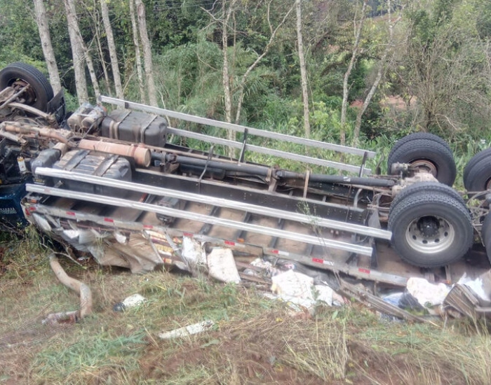 Um caminhão com doações às vítimas das enchentes no Rio Grande do Sul tombou na SC-155, entre Seara e Itá, no Oeste de Santa Catarina. O acidente ocorreu nesta sexta-feira, dia 10, próximo à ponte do Rio Caçador.