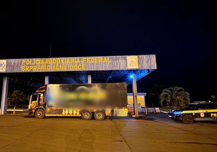Caminhão de banda musical escondia 8 toneladas de mercadoria valiosa em SC - Foto: PRF Um caminhão-baú disfarçado com inscrições de uma banda musical foi interceptado na madrugada desta quinta-feira (9), na BR-153, em Água Doce, no Meio-Oeste de Santa Catarina. O veículo transportava uma carga ilegal: aproximadamente 8 toneladas de camarão contrabandeado da Argentina.