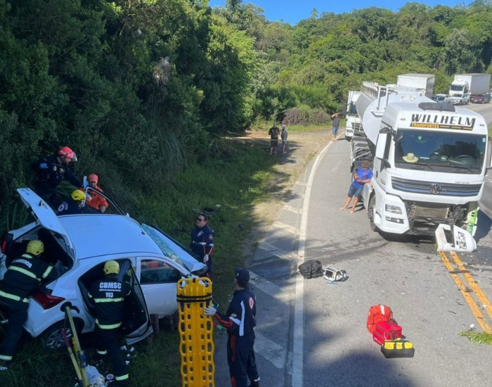 Segundo o Corpo de Bombeiros, um carro com placas de Florianópolis colidiu de frente com um caminhão com placas de Grão-Pará nesta terça-feira, dia 30.