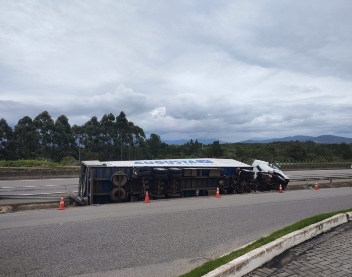 Willian Reis/Folha Regional Um caminhão tombou na manhã desta sexta-feira, dia 13, na marginal da BR-101, em Laguna. O acidente ocorreu na localidade da Barranceira, próximo a um posto de combustível, sentido norte.