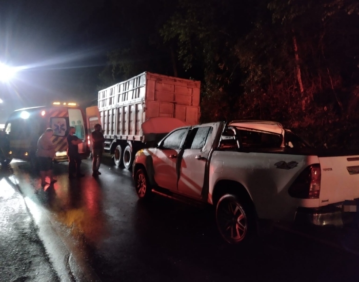 CBMSC/Divulgação/Folha Regional Um acidente de trânsito foi registrado na noite desta quarta-feira, dia 12, na SC-390 em Orleans. Segundo o Corpo de Bombeiros, um veículo Toyota Hilux colidiu na traseira de um caminhão na subida da rodovia SC 390.
