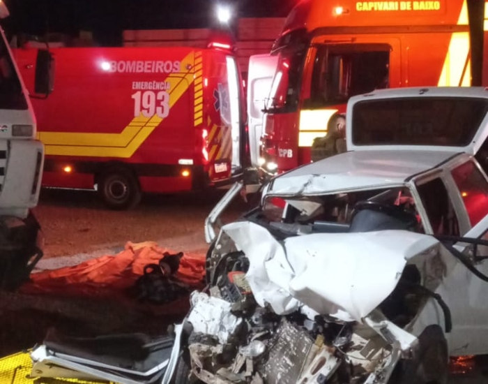 O Corpo de Bombeiros foi acionado e encontrou duas pessoas que estavam no carro, sendo que o caroneiro estava encarcerado entre as ferragens.