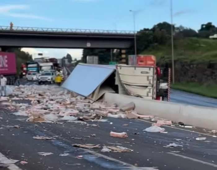 Vídeos mostram que, após a queda, a carga de frios acabou se espalhando pela rodovia e foi saqueada.