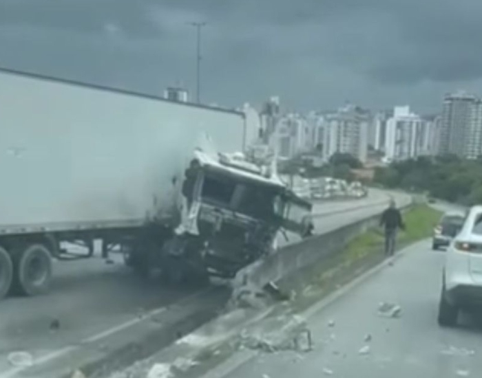 Divulgação/Folha Regional Uma carreta colidiu contra a mureta de proteção no Km 206 da BR-101 sentido norte, em São José, nesta sexta-feira, dia 7. O acidente causou o bloqueio da pista provocando filas no trecho.