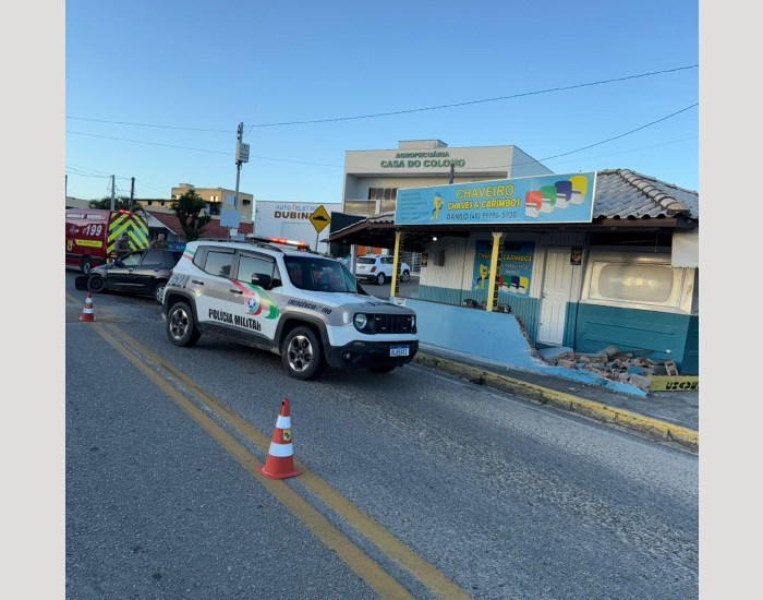 Bombeiros Voluntários/Divulgação/Folha Regional Um carro atingiu o muro de um estabelecimento comercial na Avenida Duque de Caxias, no Centro, em Jaguaruna. Os Bombeiros Voluntários foram acionados para atender a ocorrência por volta das 5h50 desta sexta-feira, dia 24.