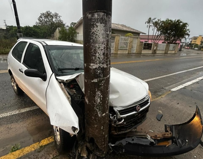 BVJ/Divulgação/Folha Regional Um acidente de trânsito foi registrado na Avenida Duque de Caxias, no Centro de Jaguaruna. Um veículo Fiat Palio com placas de São Paulo teve a frente destruída após colidir contra um poste. A guarnição dos Bombeiros Voluntários foi acionada para atender a ocorrência.